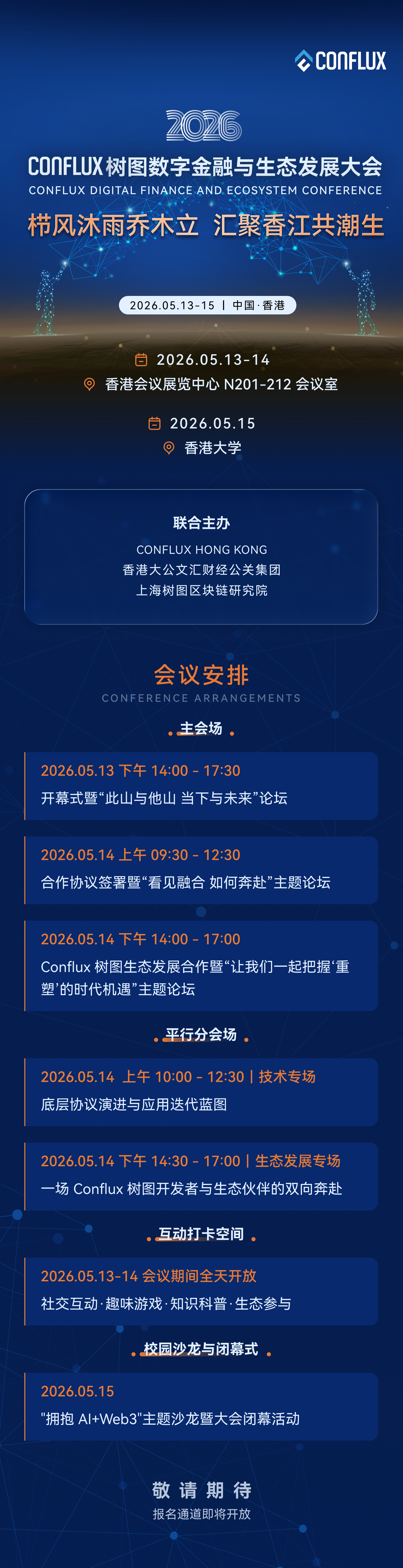 依托Conflux的技术积淀,2026年5月13日至15日,Conflux树图数字金融与生态发展大会将在香港举办。