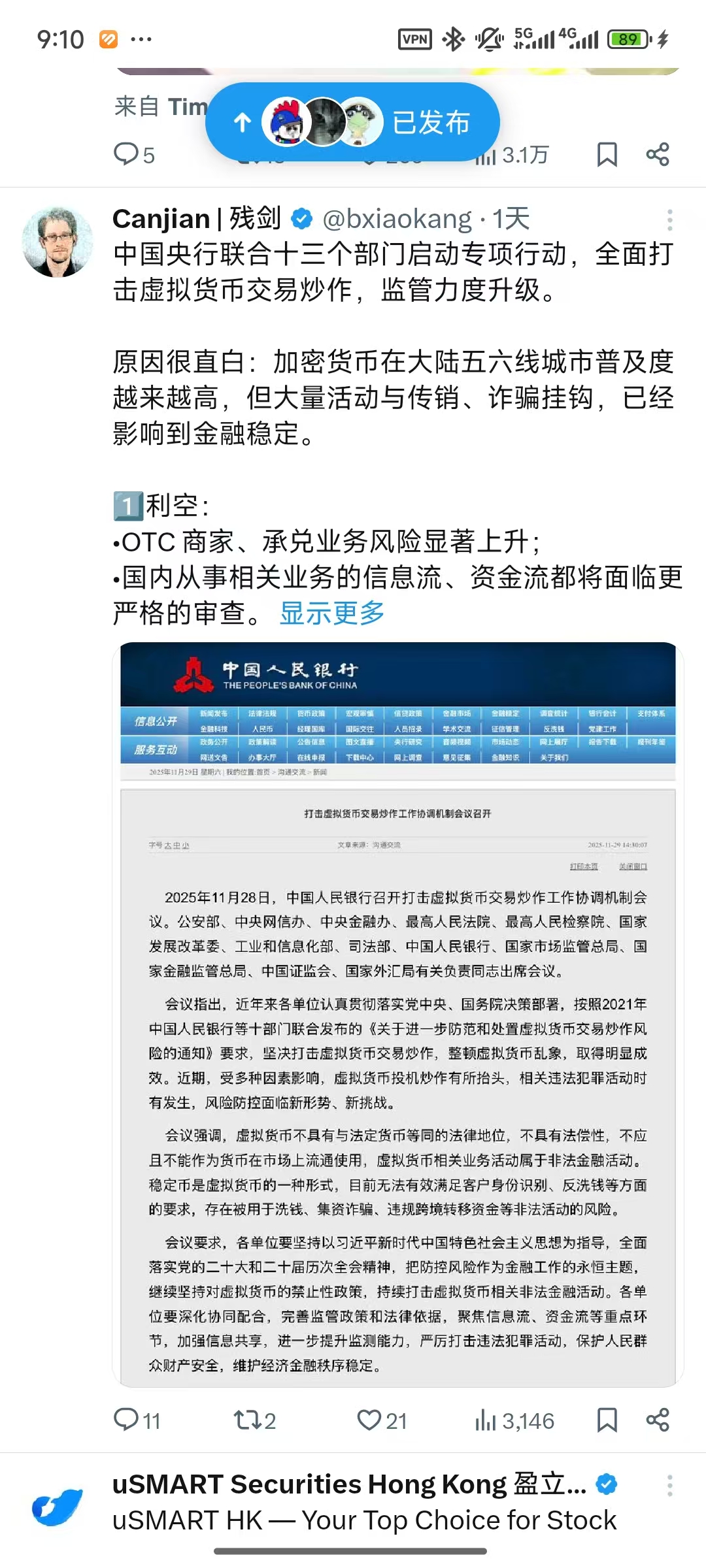 5.【国内动态】中国人民银行联合十三个部门启动专项行动,全面打击虚拟货币交易炒作,监管力度升级;