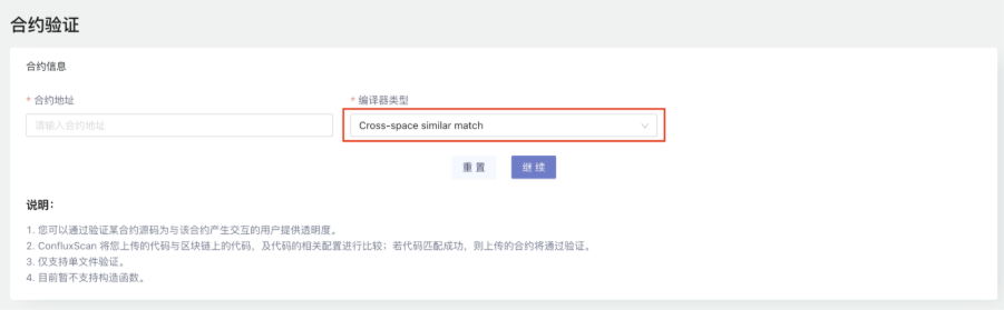 (2)支持跨Space合约验证,用于识别部署在 Conflux Core Space 与 Conflux eSpace 上的相同智能合约。当两个空间的字节码一致时,已验证的合约源码可在两者之间共享,从而减少开发者重复验证工作并提升 Conflux 生态的透明度。
