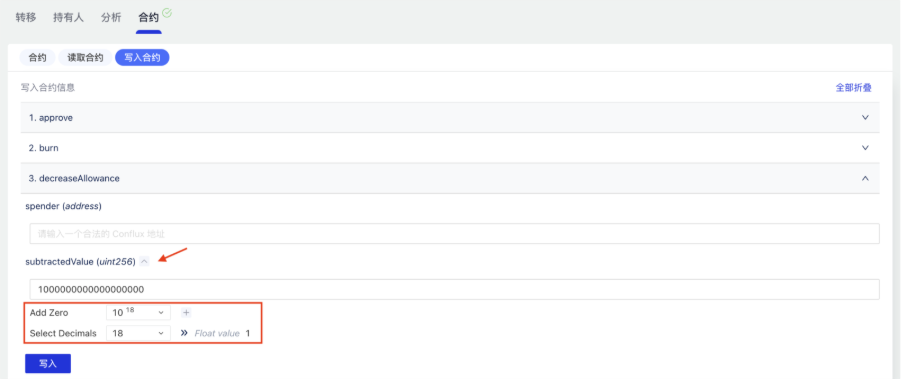 (2)在写合约中对于输入参数为 uint256/int256/uint128/int128 类型的,原输入框逻辑不变, 增加 Add Zero 辅助输入 0 功能,选择后点击 “+” 按钮,自动在输入框中填入对应数值的 0,例如选择了 10^6,点击 “+” 后,则输入框值 = 用户输入值*10^6;因为涉及 Token Amount 的参数,经常会有大量的后缀0,难以识读填写,所以增加 Add Zero和Select Decimals功能来优化用户体验,降低输错风险。