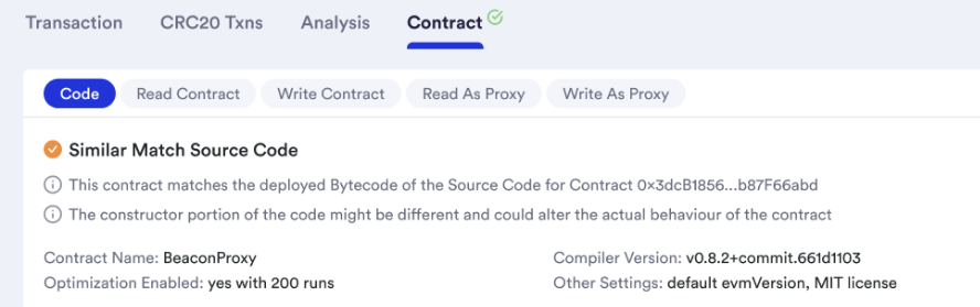 在 Beacon Proxy 架构下,逻辑合约并不直接挂在 Proxy 上,而是通过 Beacon 管理,所以会有两个地址会 Beacon 地址和 Implementation 地址。之前 Scan 上仅展示 Implementation 地址,但不展示 Beacon 地址,这个功能升级后可以提升可升级合约的透明度。