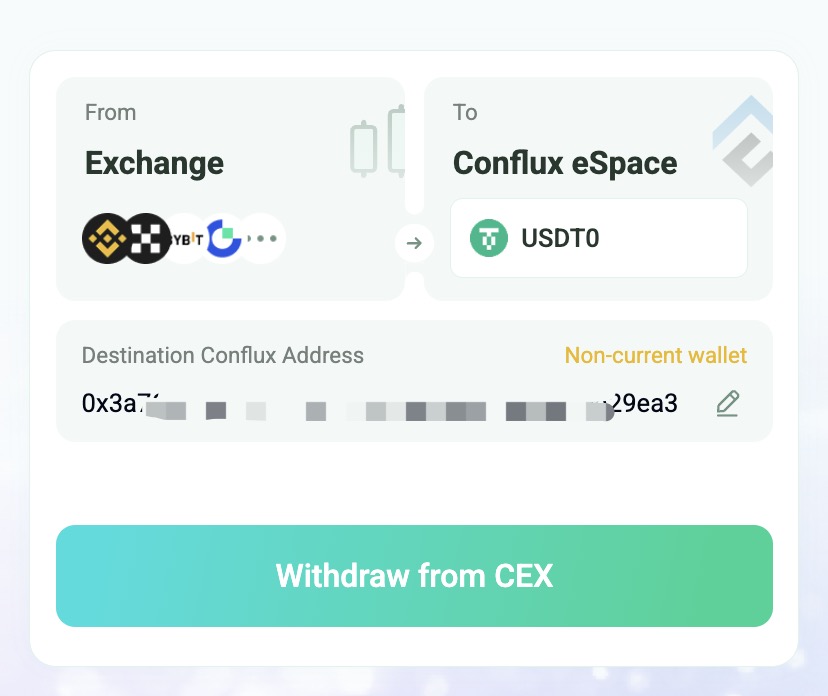 Meson 现已支持用户直接在交易所充提 Conflux eSpace 上的 USDT0。目前支持的交易所有:Binance, OKX, Bybit,Gate.io。后续将逐步增加其他常用交易所。